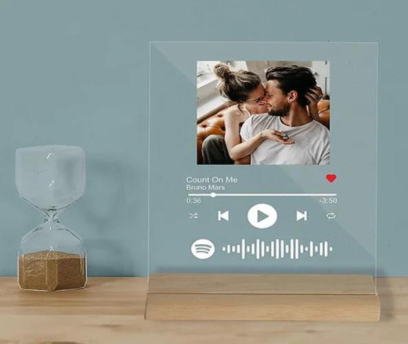 Personalized Spotify Plaque Photo Frame | Acrylic Frame Wooden Base: A customized photo frame featuring your favorite song with a scannable Spotify code and a cherished photo. The acrylic plaque is elegantly mounted on a sturdy wooden base, creating a stylish and modern decor piece. The combination of photo and song makes it a sentimental gift for special occasions like anniversaries, birthdays, or memorable moments. It’s perfect for displaying on a desk, shelf, or nightstand, offering a blend of personalized art and music, all in one beautifully designed frame.